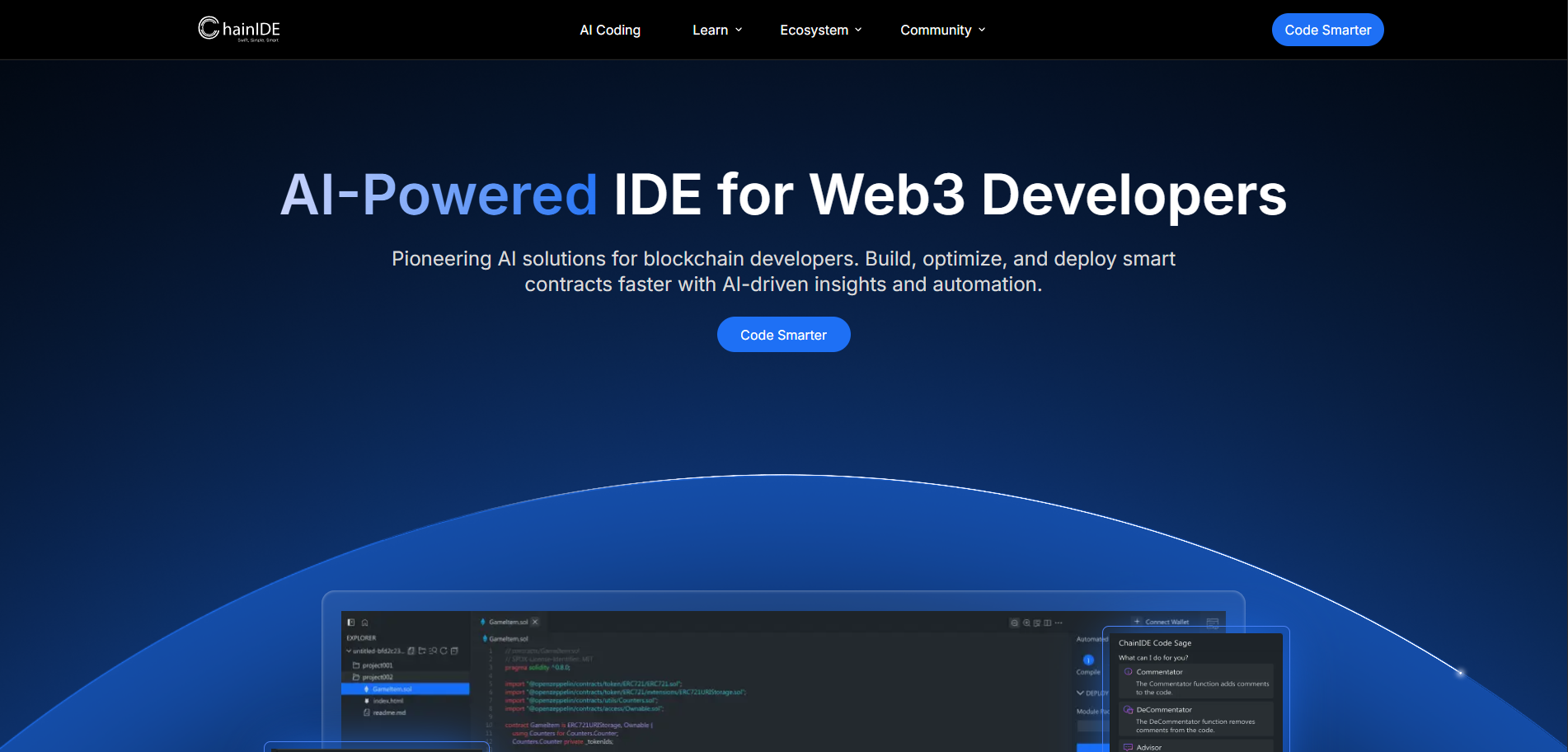 首先进入  [ChainIDE](https://chainide.com/)  的入口页面，点击 Code Smarter。