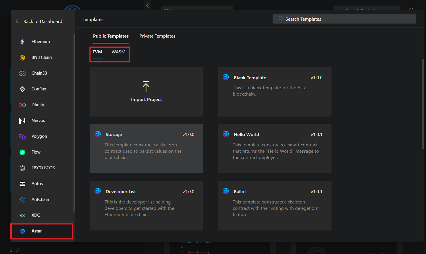出现一个弹窗，在弹窗的左侧选择 Astar，右侧先选择对应的智能合约环境 （EVM 或 WASN）,再点击一个项目模板创建项目。